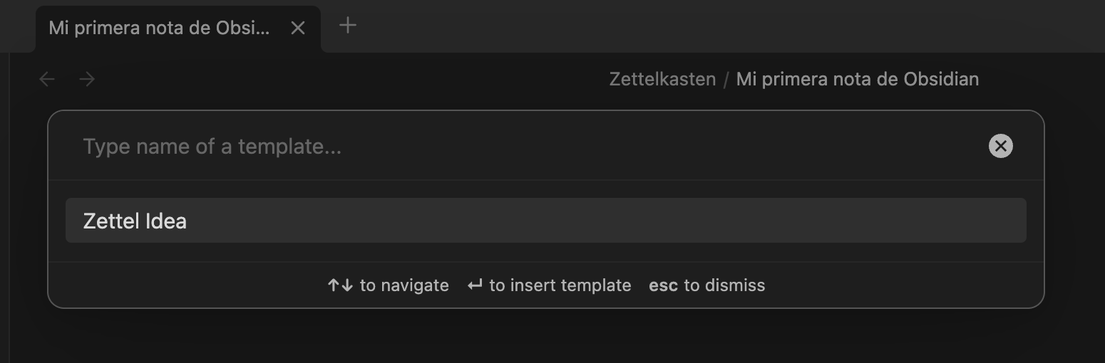 Una vez en la nota vacía solo con el título, agrega la plantilla utilizando el atajo que creamos: Cmd + Opt + T. Selecciona la plantilla ‘Zettel Idea’ y presiona Enter.