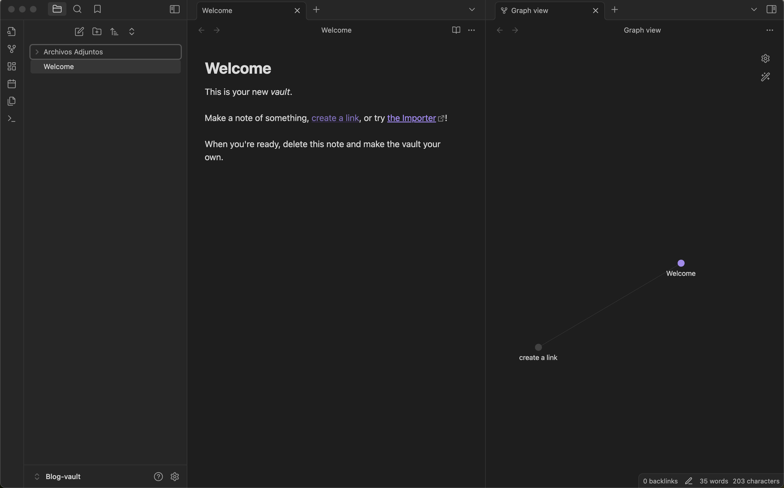 Una vez creado un nuevo Vault, Obsidian se ve de la siguiente forma: